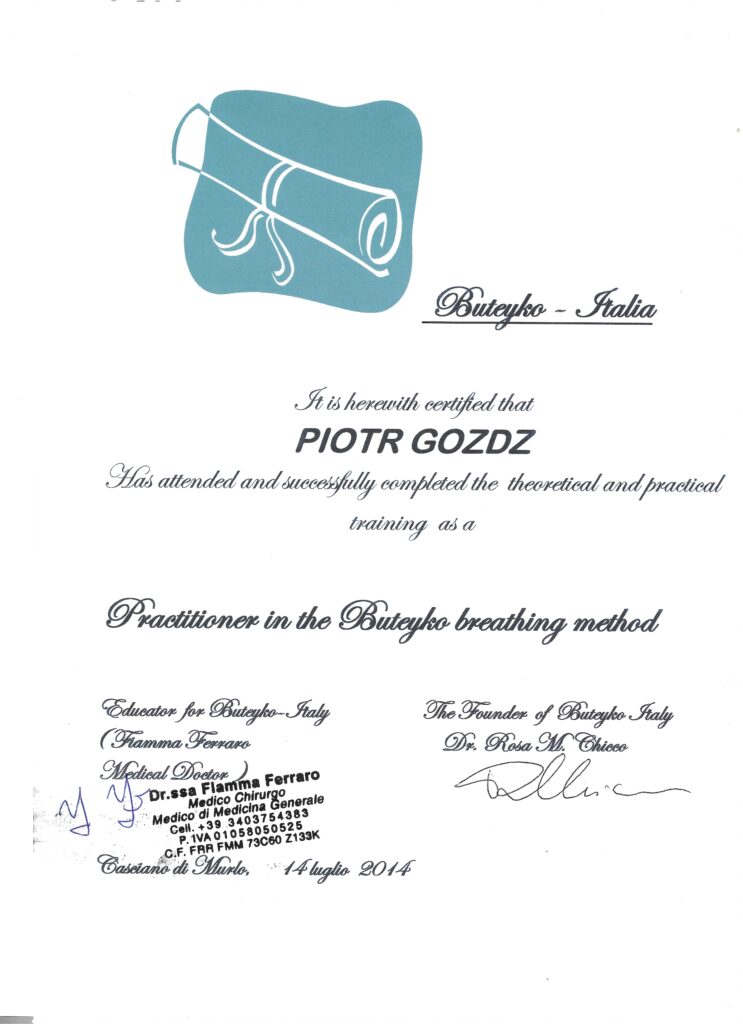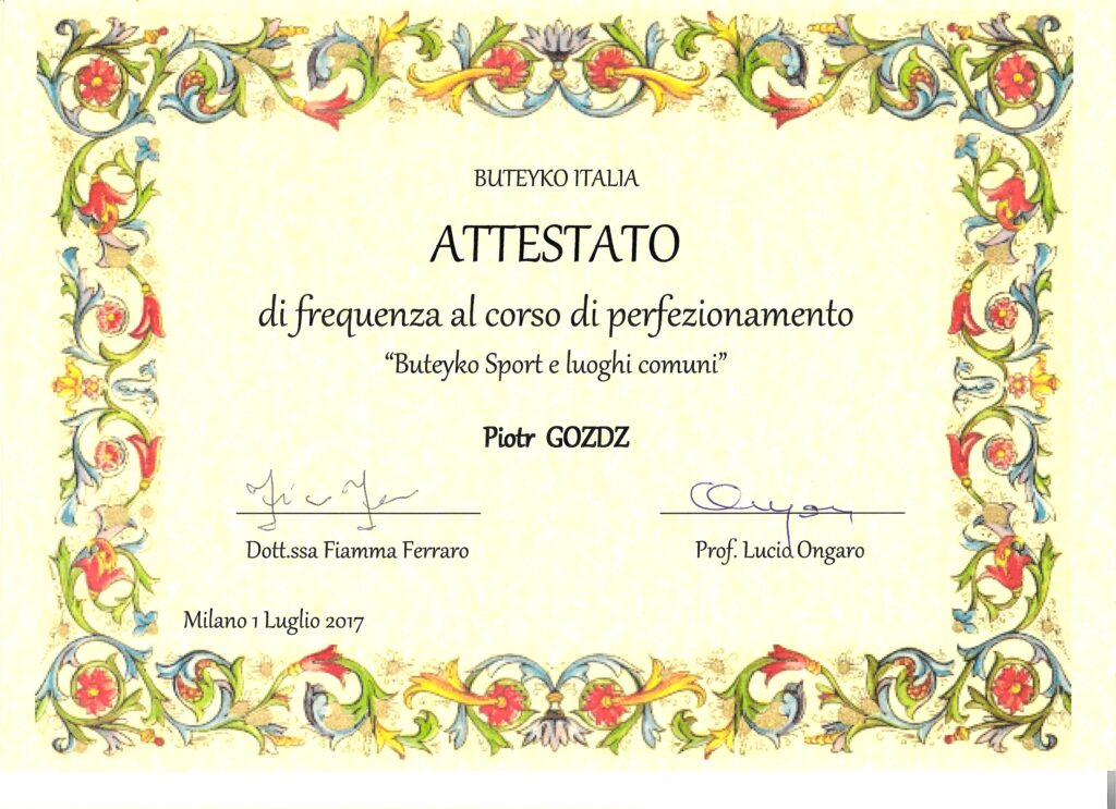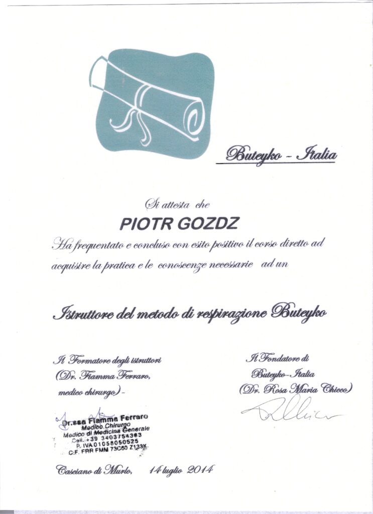 - Certyfikaty instruktora Buteyko ( Buteyko Italia, 2014 / 2017),