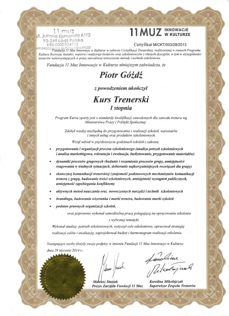 W 2014 roku ukończyłem Kurs Trenerski I stopnia (Fundacja 11 Muz – Innowacje w Kulturze), zdobywając formalne kwalifikacje w zakresie projektowania i prowadzenia szkoleń.