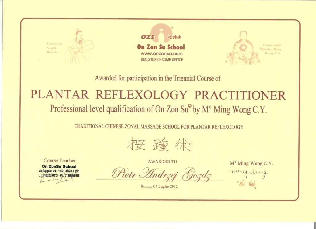 - Dyplom refleksologii On Zon Su ( Rzym, 2012 ),